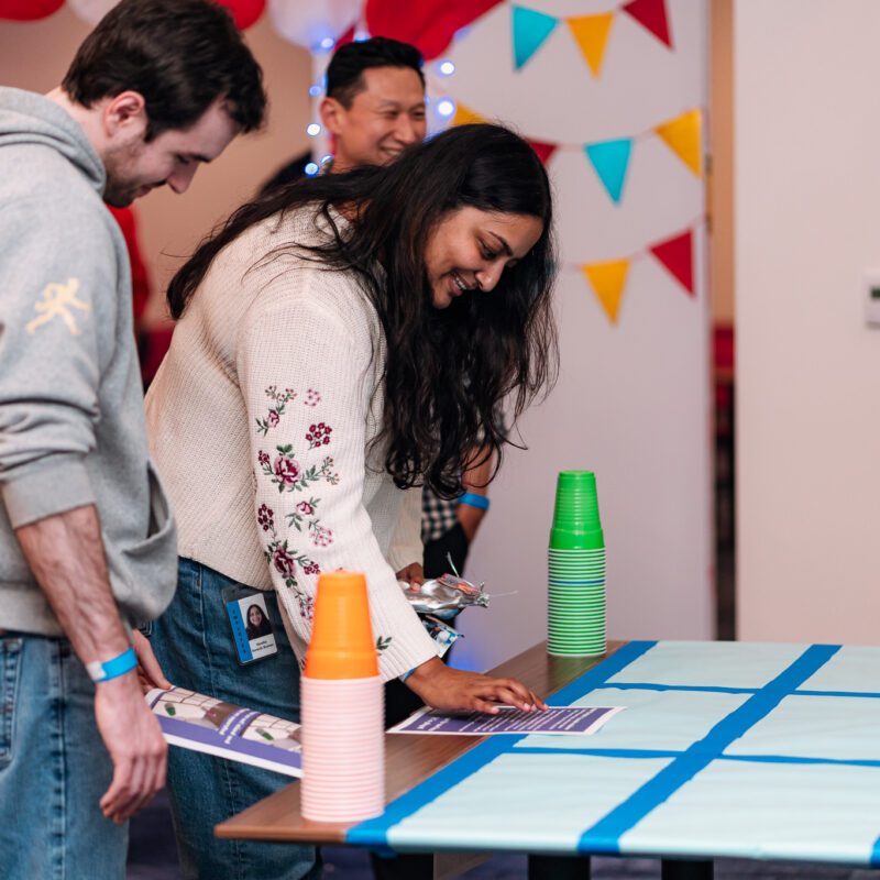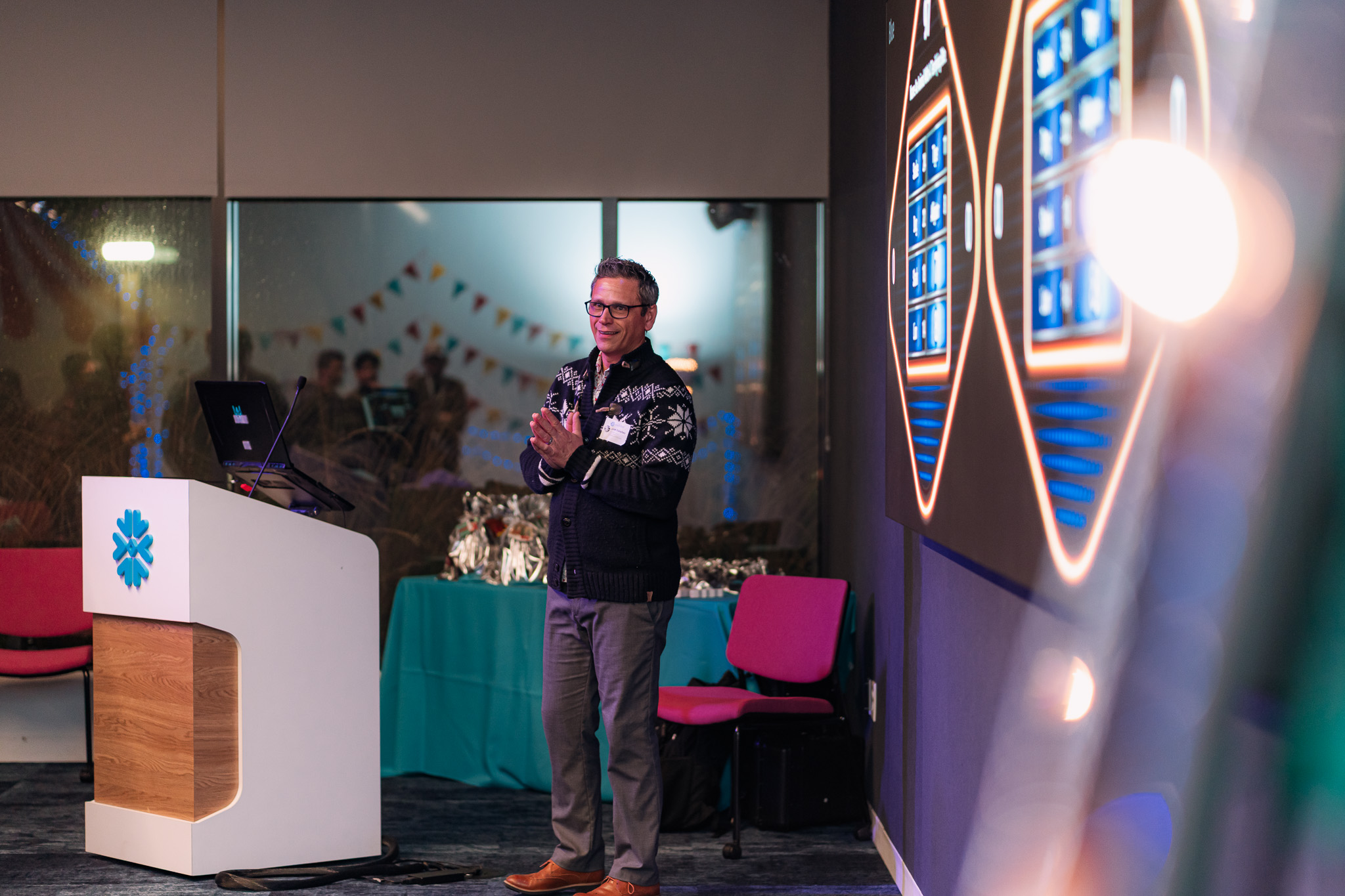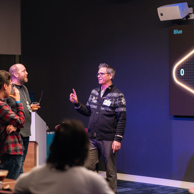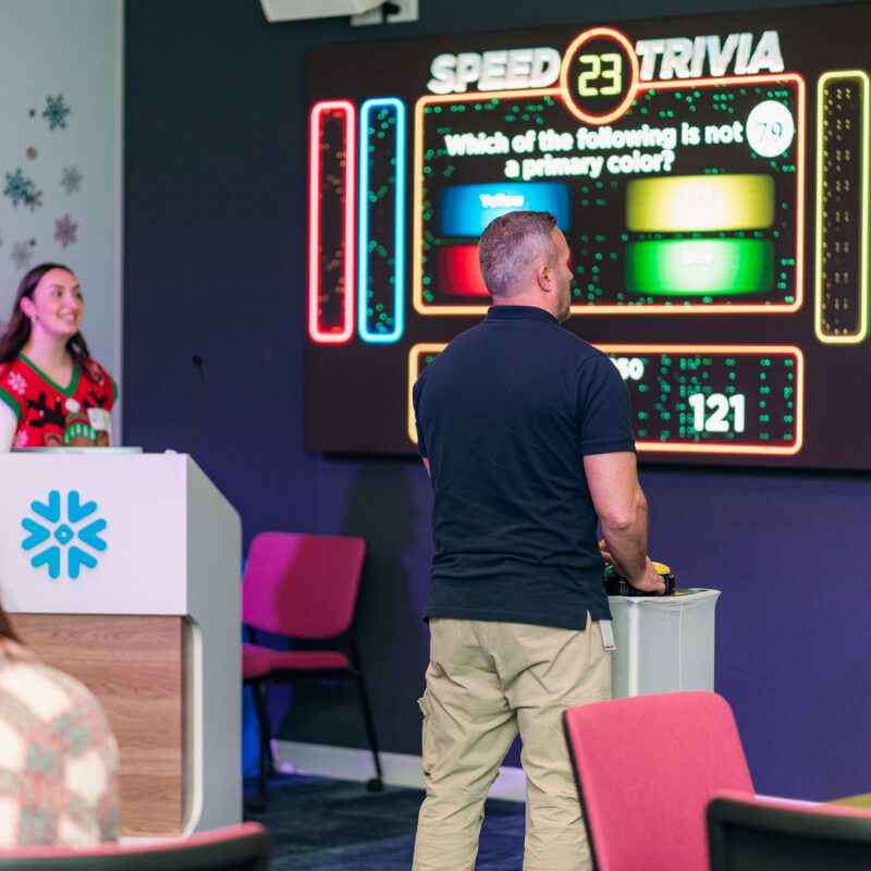 A cloud-based data company with a large Bellevue, Washington office hosted a 550-guest in-office corporate holiday party. The goal was to celebrate the year, boost team connection, and create a high-energy, interactive employee event that reflected the company’s culture.